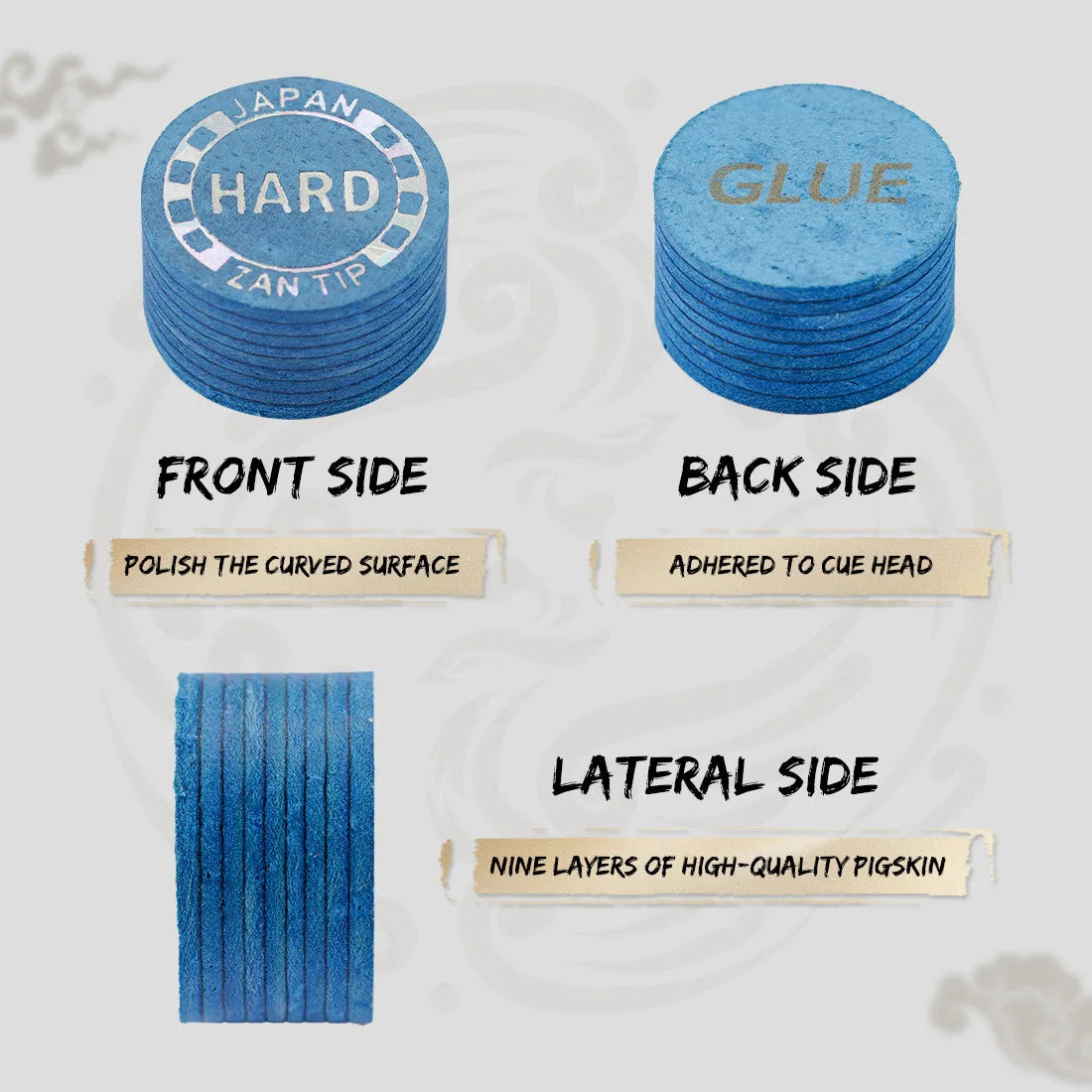 Zan tips are made with the finest leathers which are resistant to mushrooming, peeling, delamination and humidity.Zan Tips are handmade and each layer is specially laminated, which creates a comfortable and positive sound when you strike the cue ball.