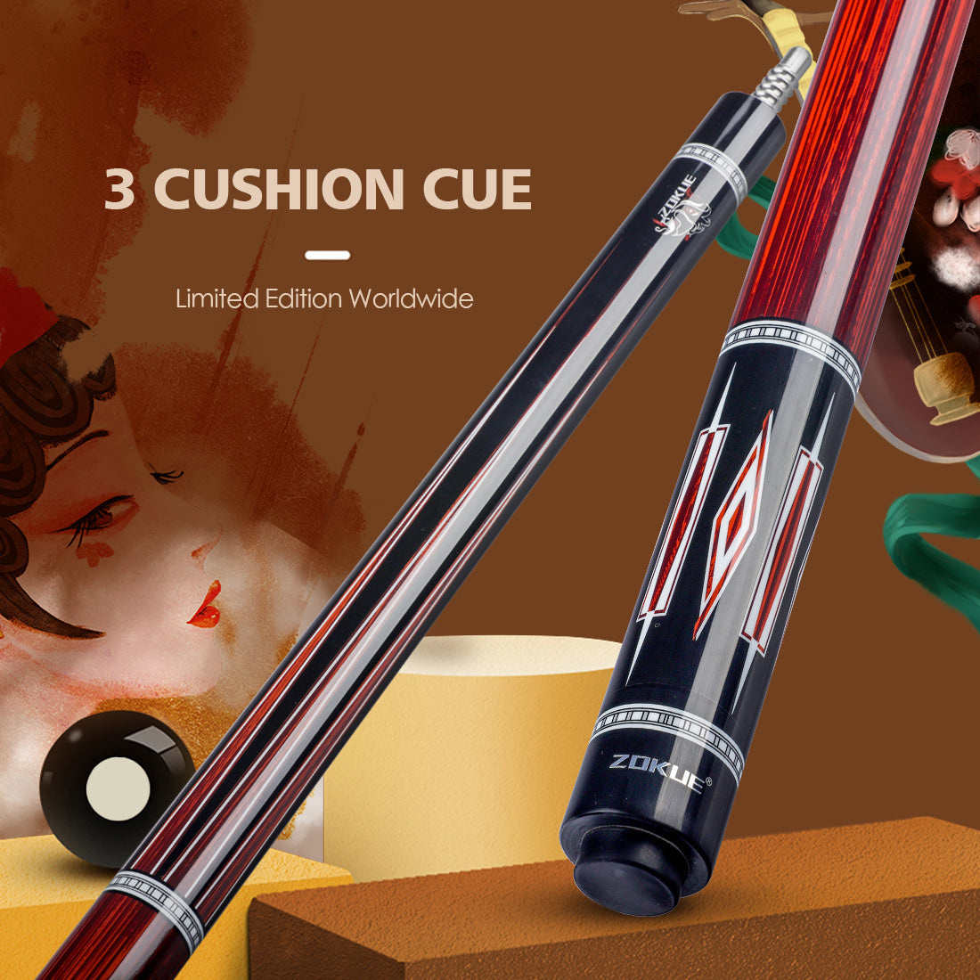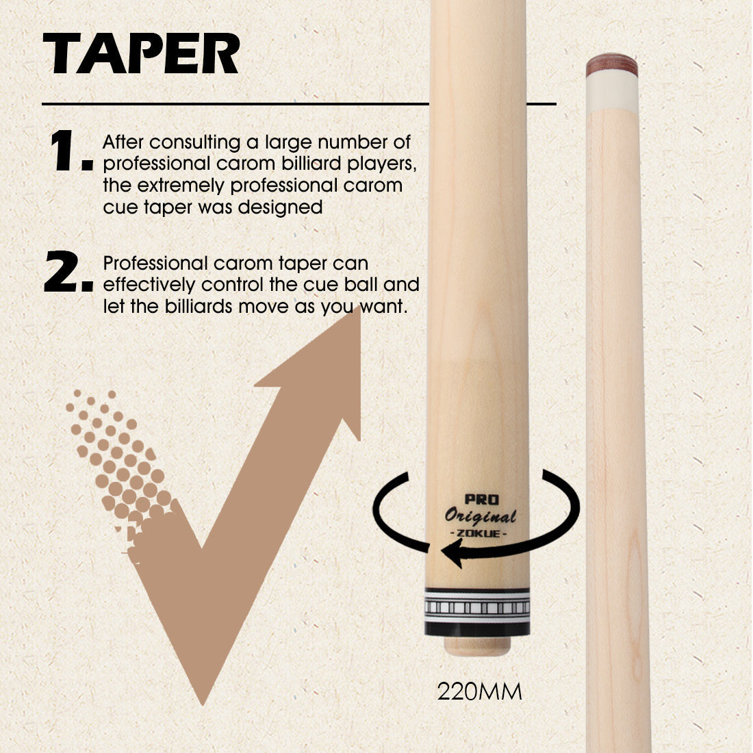 - After consulting a large number of professional carom billiard players, the extremely professional carom cue taper was designed.