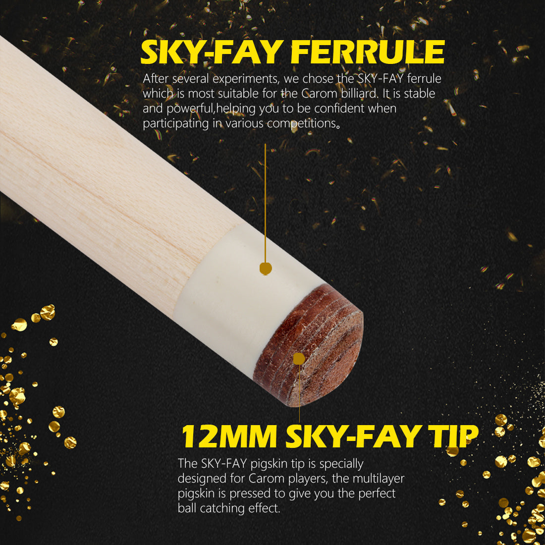 - The SKY-FAY pigskin tip is specially designed for Carom players, the multilayer pigskin is pressed to give you the perfect ball catching effect.